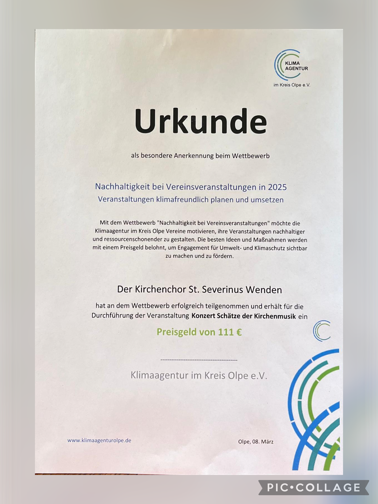Die Klimaagentur des Kreises Olpe verleiht unserem Chor einen Preis für Nachhaltigkeit für unser Konzert SCHÄTZE DER KIRCHENMUSIK, das am 5. April 2025 in St. Severinus Wenden stattfand.